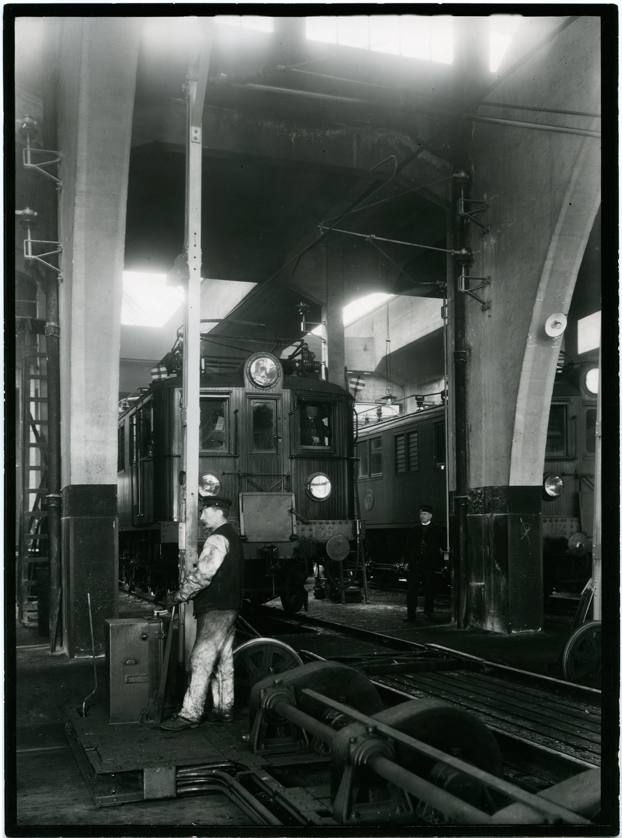 Vy i lokhallen i Hagalund Ö. Elloken som syns på fotot är Statens Järnvägar, SJ Dg 135 och Statens Järnvägar, SJ D 102.