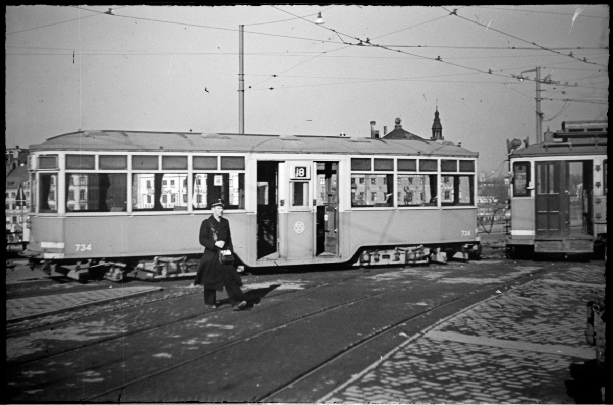 Vid hållplats på linje 18 mellan Slussen - Gröndal ses konduktör på spårvägen bredvid Aktiebolaget Stockholms Spårvägar, SS B17 734 "två-rum-och-kök".