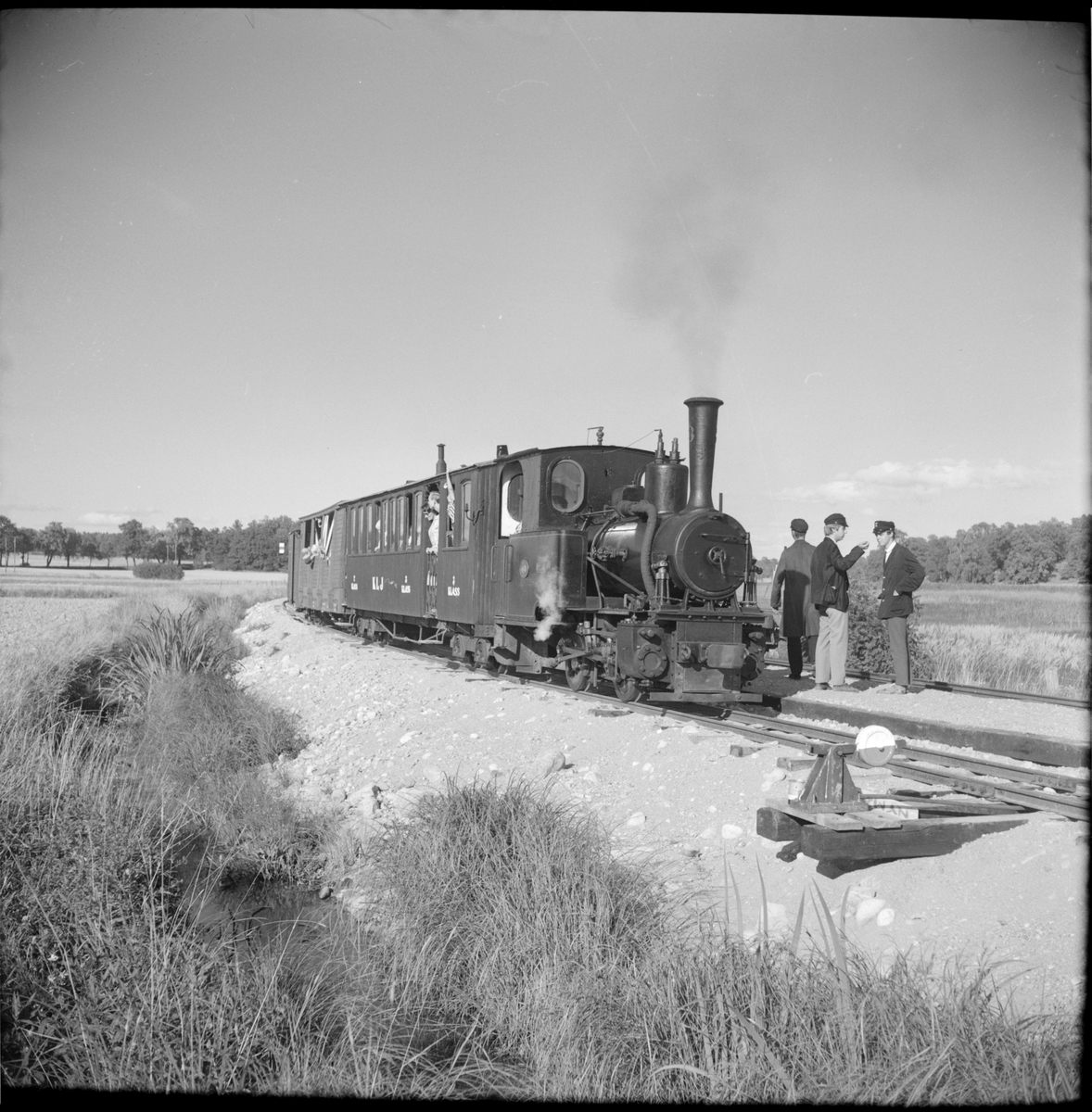 Museijärnvägen Östra Södermanlands Järnväg, ÖSlJ lok 3 "Dylta" med en kombinerad 2:a klass och 3:e klass personvagn från Kosta - Lessebo Järnväg, KLJ vid en station.