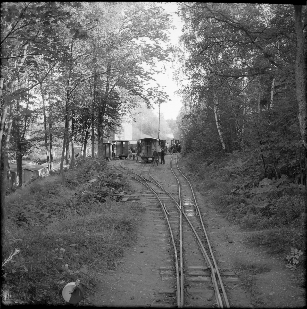 Museijärnväg Östra Södermanlands Järnväg, ÖSlJ. I ogräset vid växeln till vänster i bild ses en dressin. Mitt i bild ÖSlJ ånglok och vagnar vid hållplats Lina bruk.