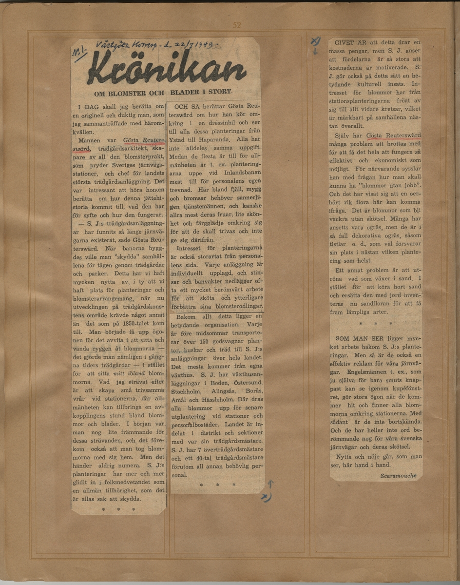 Tidningsklipp ur "Uppsatser om trädgårdar m.m. som på ett eller annat sätt beröra Gösta Reuterswärd. Samlade av Ernst Hj."