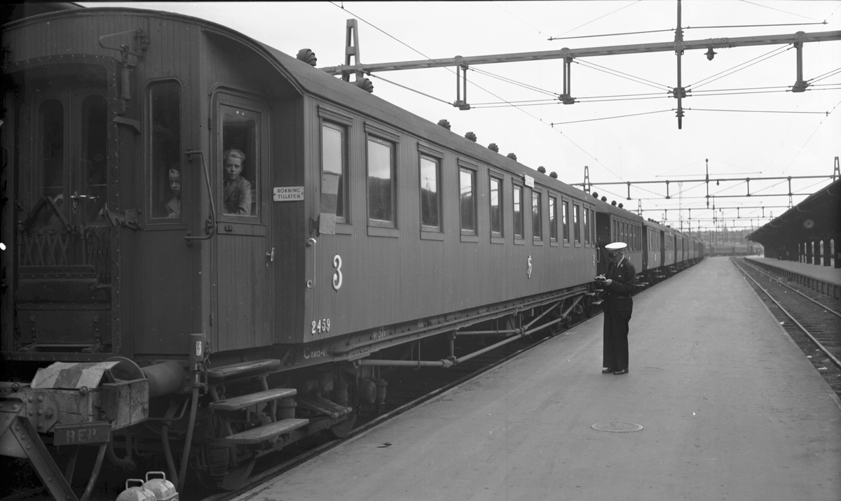 Statens Järnvägar, SJ Co8c 2459. SJ säkerhetstjänst. Tågbefälhavare som går och skriver upp vagnuppgifter vilka seda lämnas över till lokföraren.