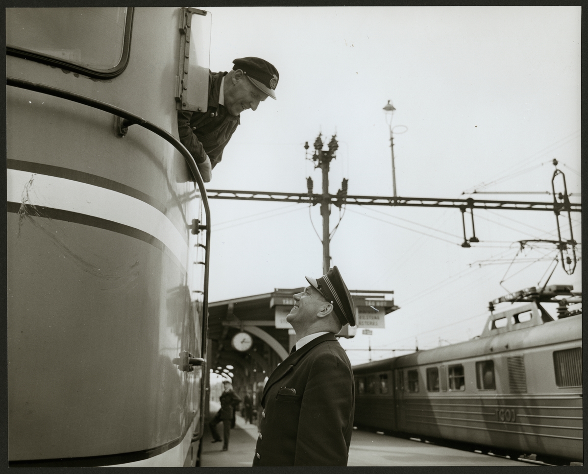 Lokförare i samtal vid stationen i Flen maj 1964.