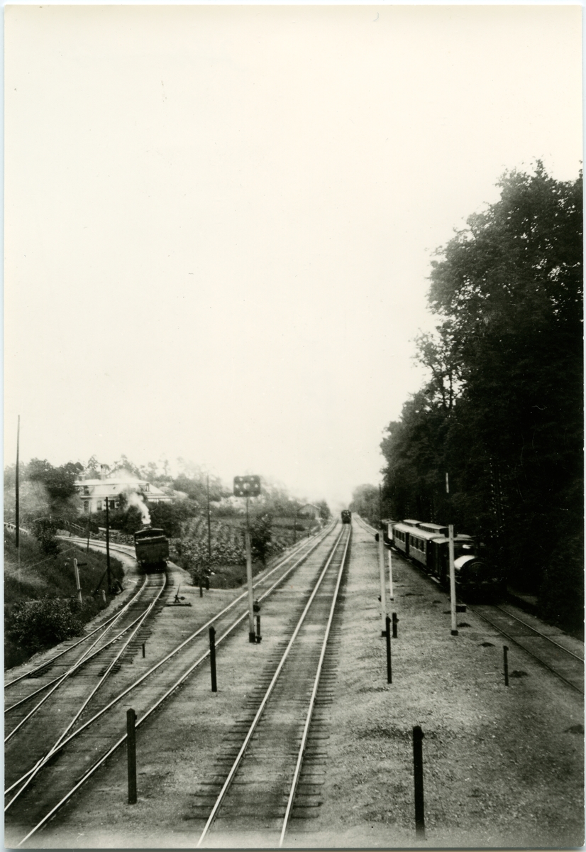 Norra änden av Tomteboda bangård. Till vänster Stockholm - Västerås - Bergslagens Järnvägs, SWB, spår mot Sundbyberg och Västerås. Bortåt i bild Norra stambanan mot Uppsala. Loket till vänster SWB lok 41 och till höger SWB lok 2.