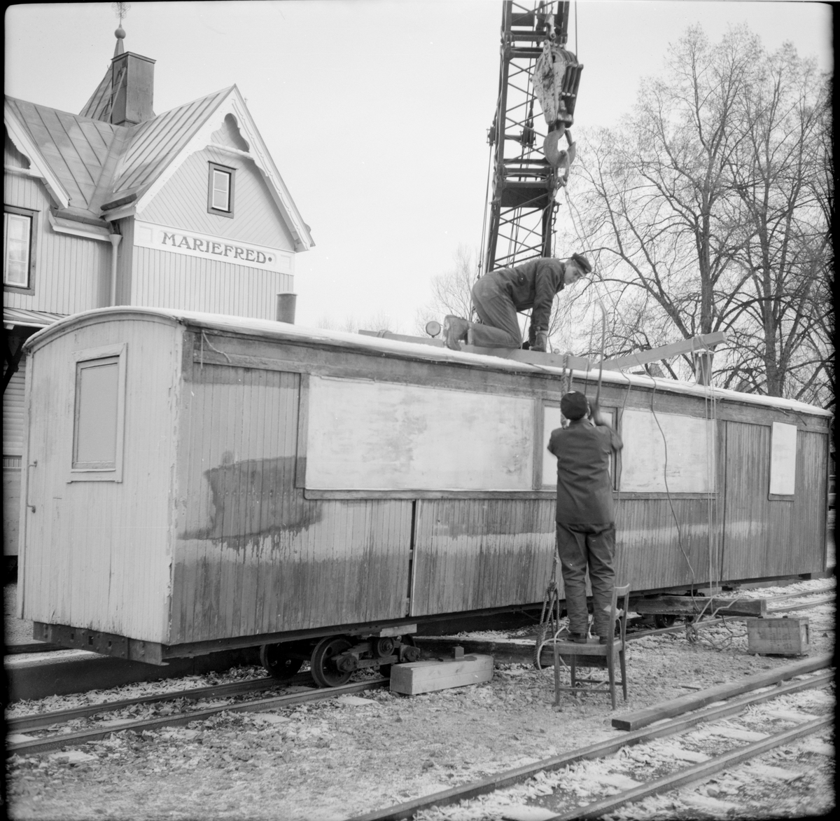 Lyftanordning på godsvagn för transport av kranbil på järnvägsstationen i Mariefred, som användes av Museijärnväg Östra Södermanlands Järnväg, ÖSlJ.