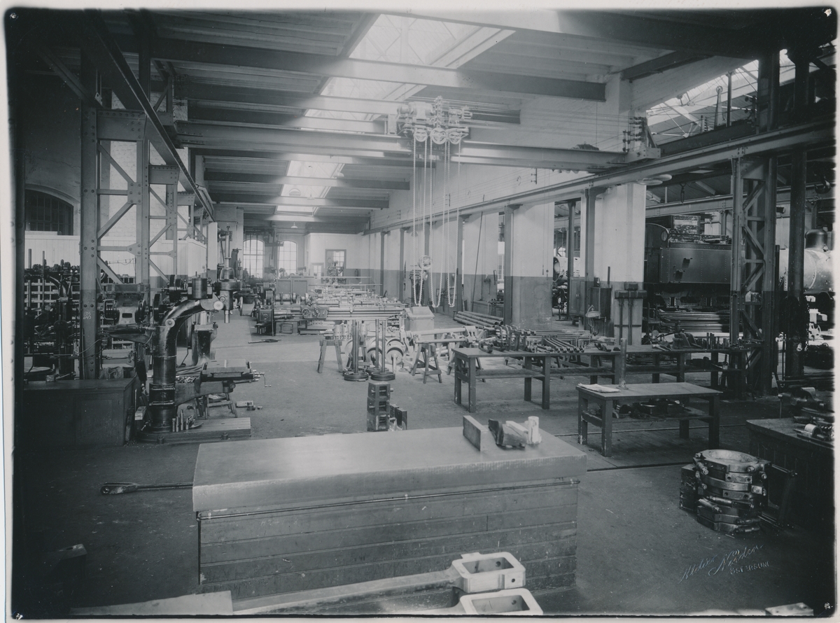 Titel: Interiör av maskinverkstaden sett mot öster. Ånglok står till höger i bild.