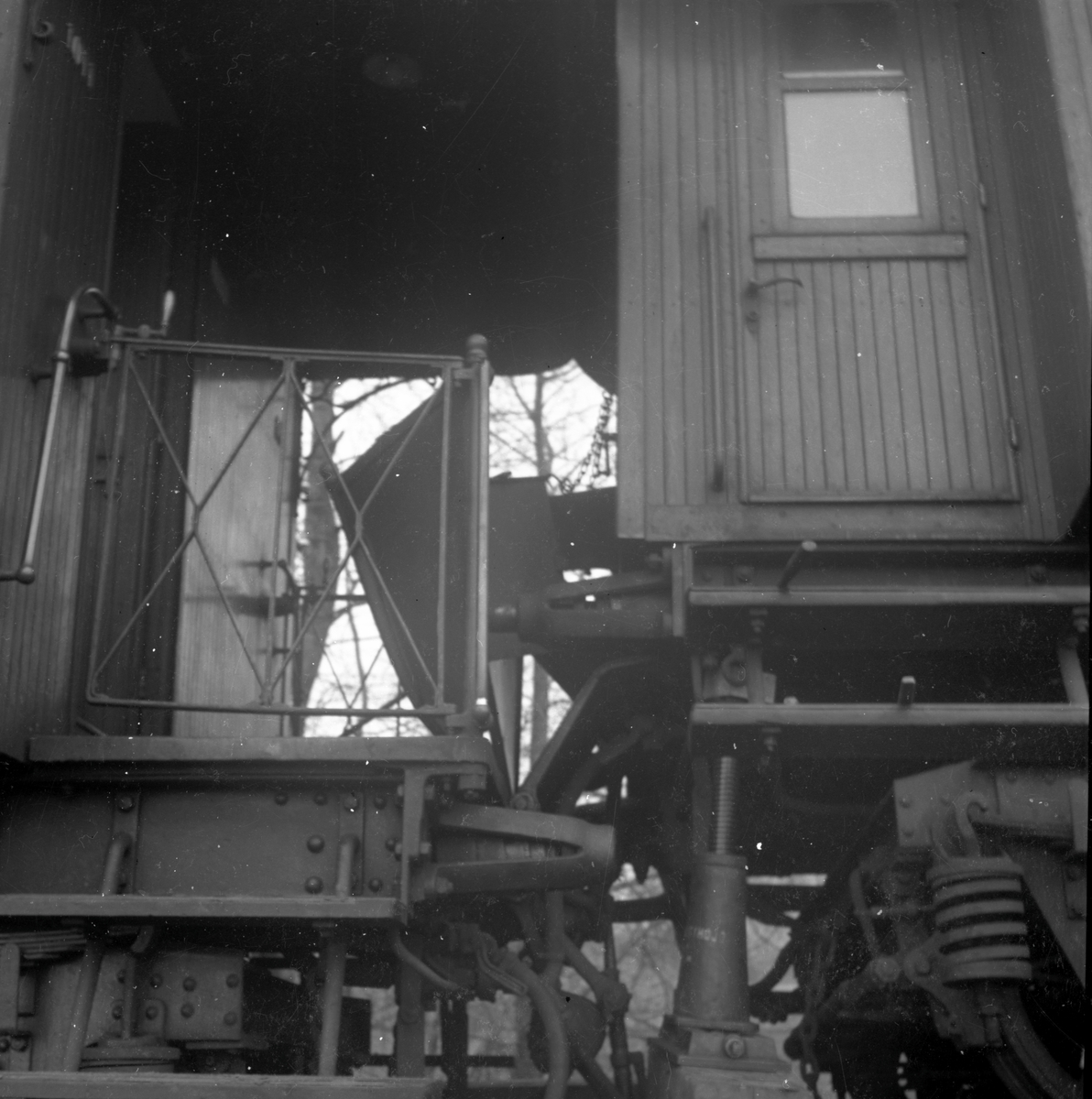 Tårurspårning vid Bredaryd. Tåget var på väg till Halmstad. Det tillhörde Halmstad-Nässjö Järnvägar, HNJ, och drogs av ångloket HNJ 28 och bestod av fyra vagnar. En resgodsvagn, HNJ F3 761, en postvagn HNJ 19 och två personvagnar däribland HNJ 1011.