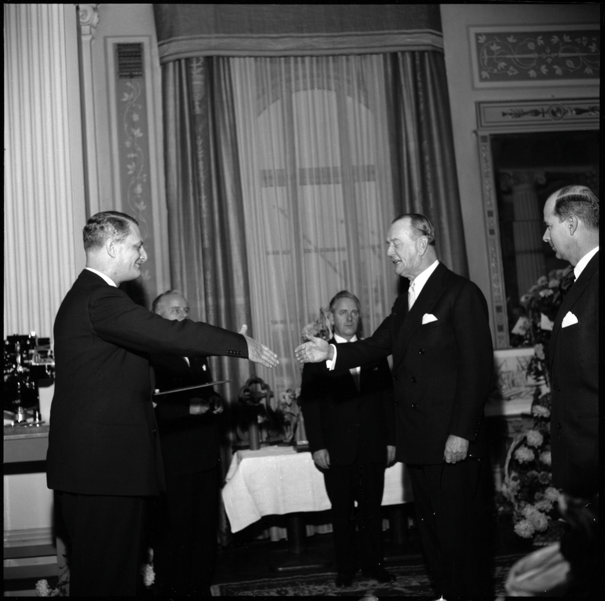 Generaldirektör Erik Upmark tar emot gåvor från Telestyrelsen.