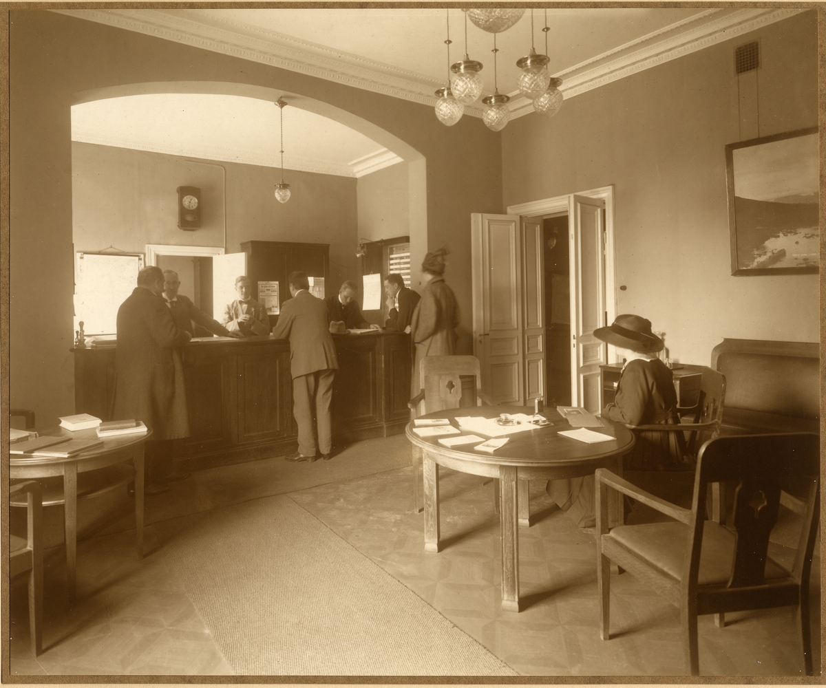 Statens Järnvägars expedition för kombinerade biljetter och upplysningar. (SJ Resebyrå), Klarabergsgatan 68 Stockholm. Åren 1915-1918.