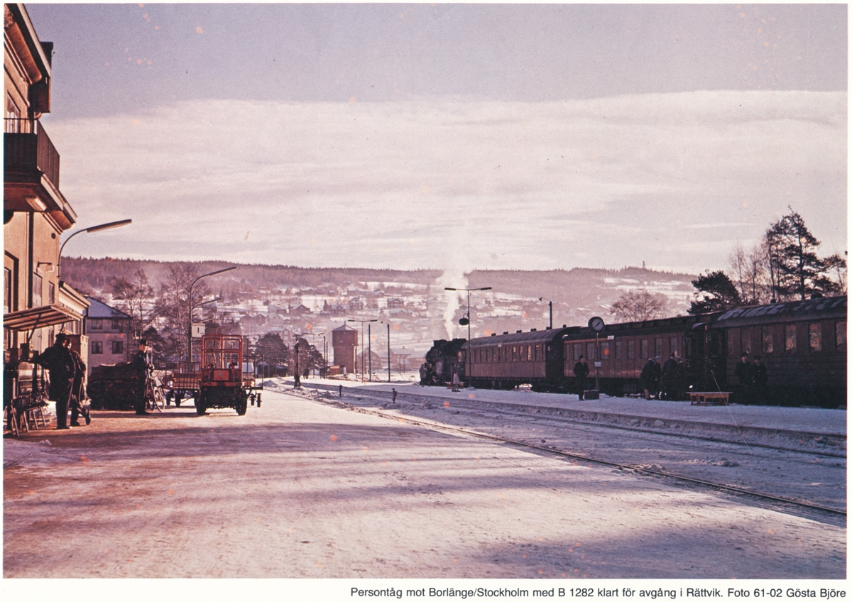 Persontåg med ånglok statens järnvägar (SJ B 1282) klart för avgång mot Borlänge - Stockholm på Rättvik station, februari 1961.