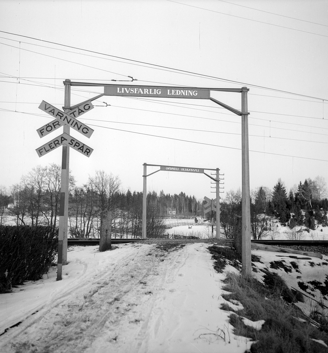 Vägövergångar. Kryssmärke med vinklar, flera spår nånstans mellan Stockholm Central och Uppsala. Varning för tåg.