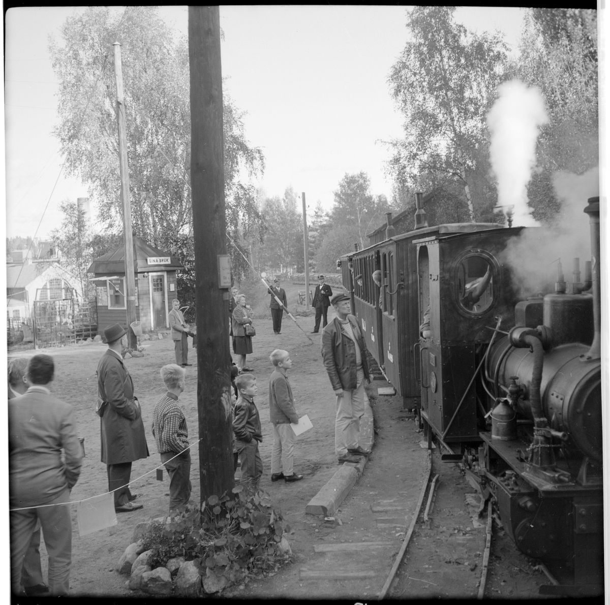 Museijärnväg Östra Södermanlands Järnväg, ÖSlJ. Resande till ÖSlJ persontåg med lok 2 "Lotta" vid Lina tegelbruk.