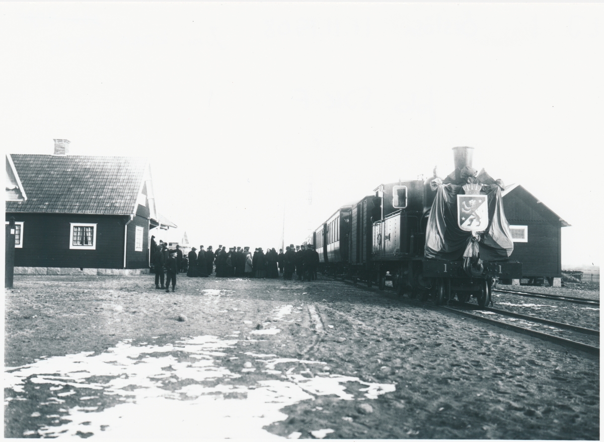 Örslösa station. Lidköpings Järnväg, LJ. Invigningståget på "Kållandsbanan" Lidköping-Tun. Det "högtidsklädda" tåget passerar Örslösa station. Hösten 1938 avvecklades trafiken.