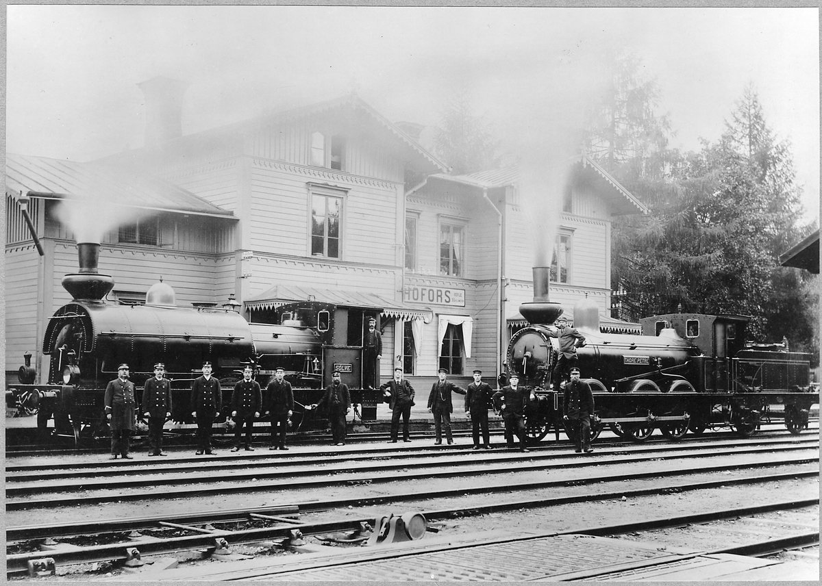 Stationspersonal uppställd vis för fotografering. Gävle - Dala Järnvägar, GDJ B 10 "Thore Petre" och GDJ C 24, "Sölve".