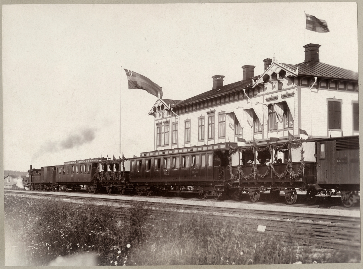 Järnvägsföreningens blomstersmyckade tåg i Härnösand. Härnösand - Sollefteå Järnväg, Härnösand - sollefteå Järnväg, HdSJ, vagnen närmast loket är en av HdSJ BCo 301-302 därefter sommarvagn, personvagn HdSJ BCo 310, sommarvagn samt en HdSJ F.