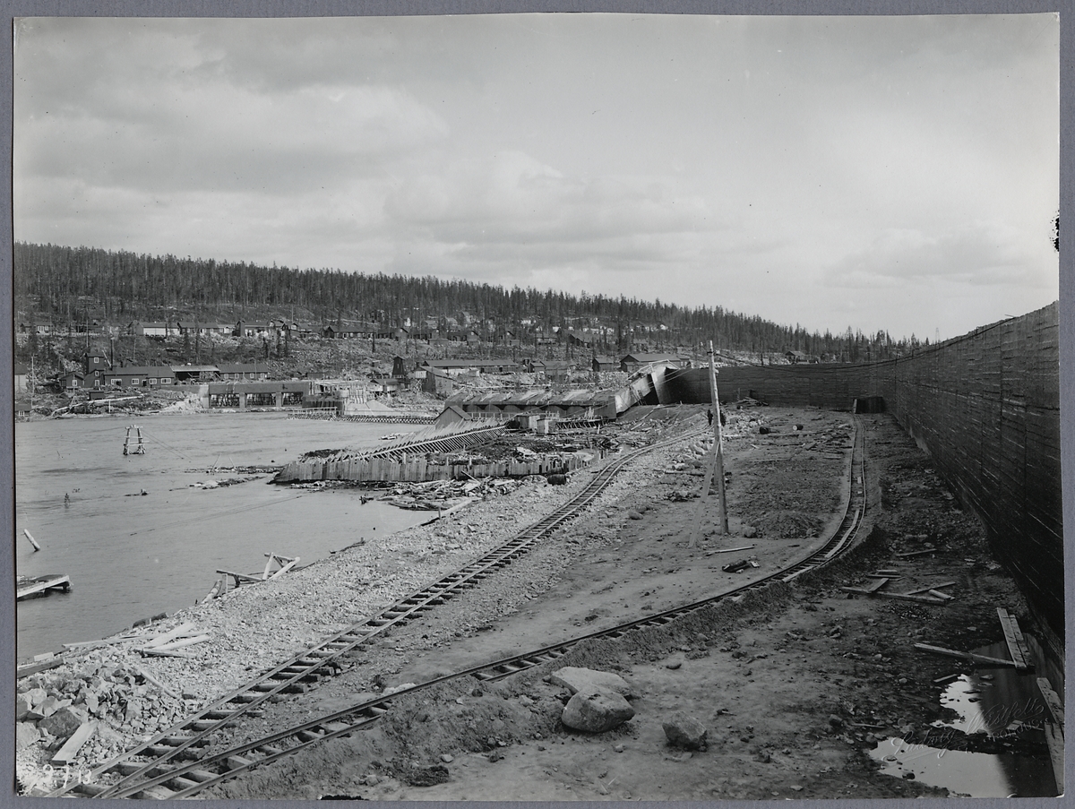 Porjus kraftverk i Stora Luleälv under byggnation. Utsikt över stora skibordet i intaget.