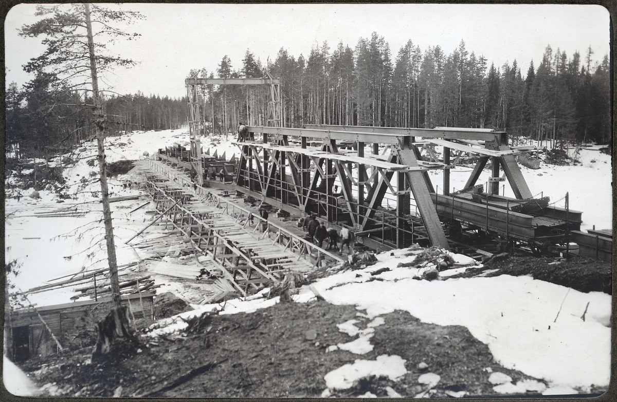 Överbyggnaden sättes upp vid brobygget över Vindelälven. Statens Järnvägar, SJ godsvagn 15174