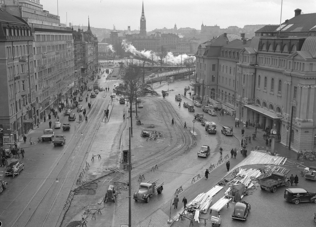 Vasagatan med Centralplanen och Centralstationen. Vid trafikomläggningen för tunnelbanebygget 7 januari 1952.