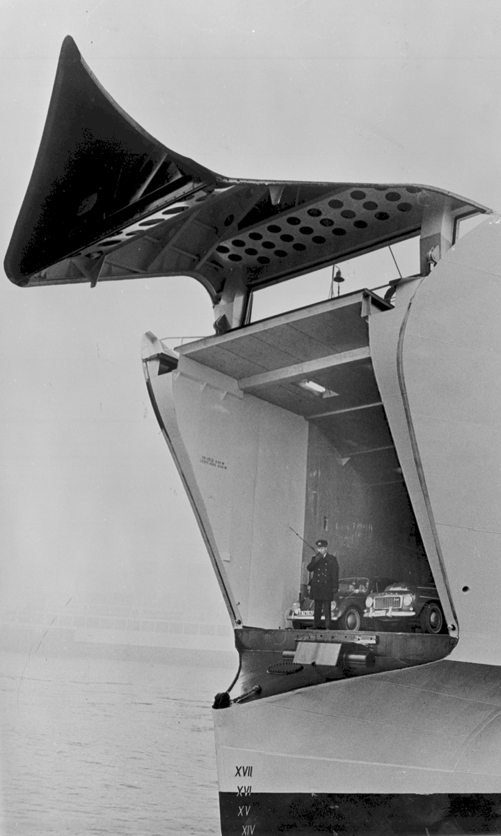 Invigningsresa med M/S "Gustav Vasa". Levererades 10 april 1965 till Lion Ferry Ab, Halmstad. Utchartrad samma dag till Statens Järnvägar, SJ, Malmö. Bogvisir