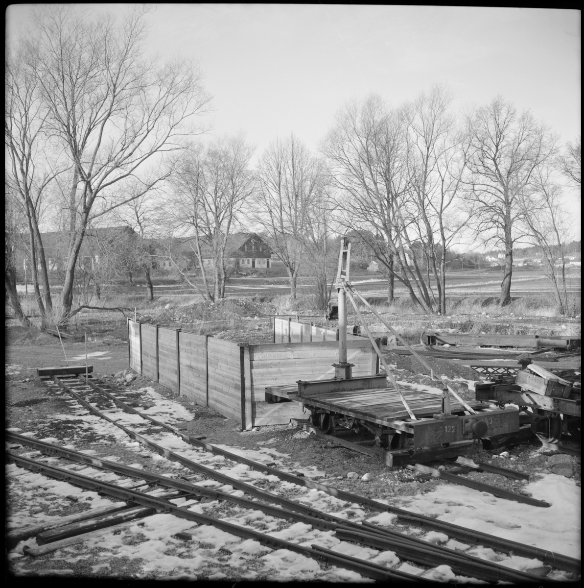 Del av bangården bredvid Storgatan i Mariefred som användes av Museijärnväg Östra Södermanlands Järnväg, ÖSlJ. Godsvagn 122 med kran till höger i bild.