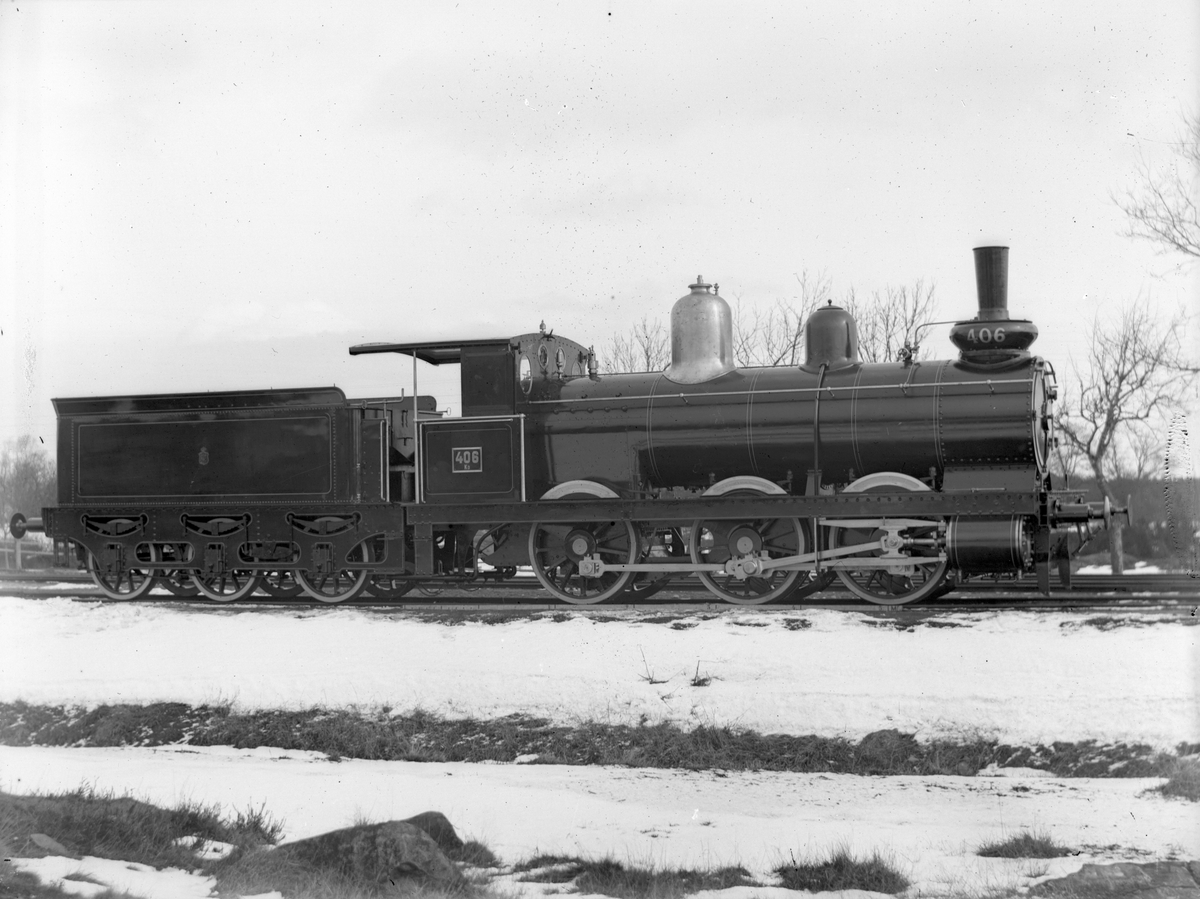 Statens Järnvägar, SJ Kd2 406. Loket tillverkades av Nohab och hade högsta hastighet 60 km i timme. Bilden är troligen tagen vid leveransen. Kd-lok var vid leveransen försedda med tender littera C, som snart utbyttes mot DK-tendrar. Loket blev skrotad 1925 i Göteborg.