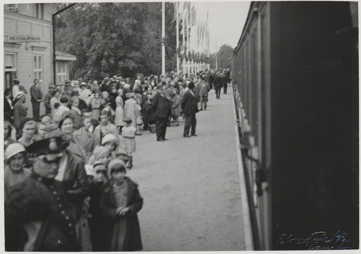 Folk har samlats på Järnvägsstationen i Vansbro vid invigningen av Statsbanan Malung-Vansbro. Strax avgår invigningståget mot Malung.
