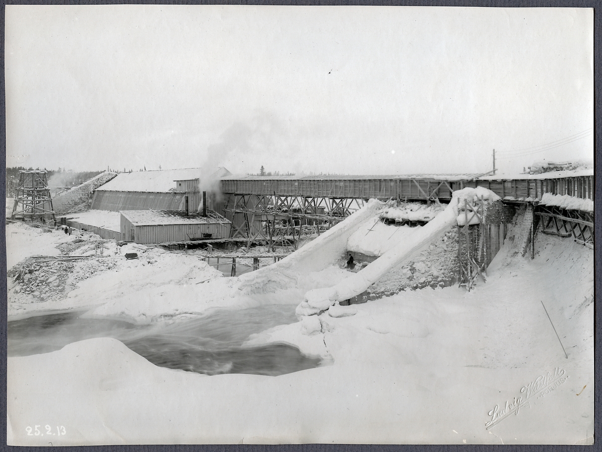 Porjus kraftverk under byggnation vid Stora Lule älv. Varmhus och transportbana i stora älvfåran.
