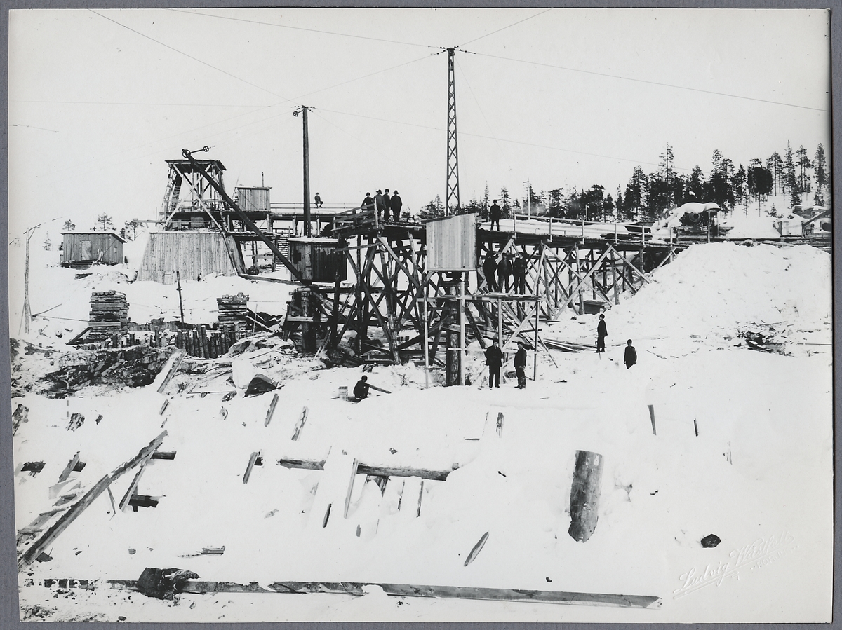 Porjus kraftverk under byggnation vid Stora Lule älv. Arbeten vid utloppet.