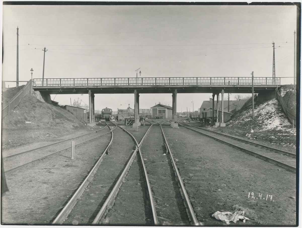 Värtan. Spårvägsbron före spårutvidgningen.Statens Järnvägar, SJ. Banan öppnades 1882. Provelektrifiering genomfördes1905 men den lades ner. 1940 elektrifierades banan slutgitligt.