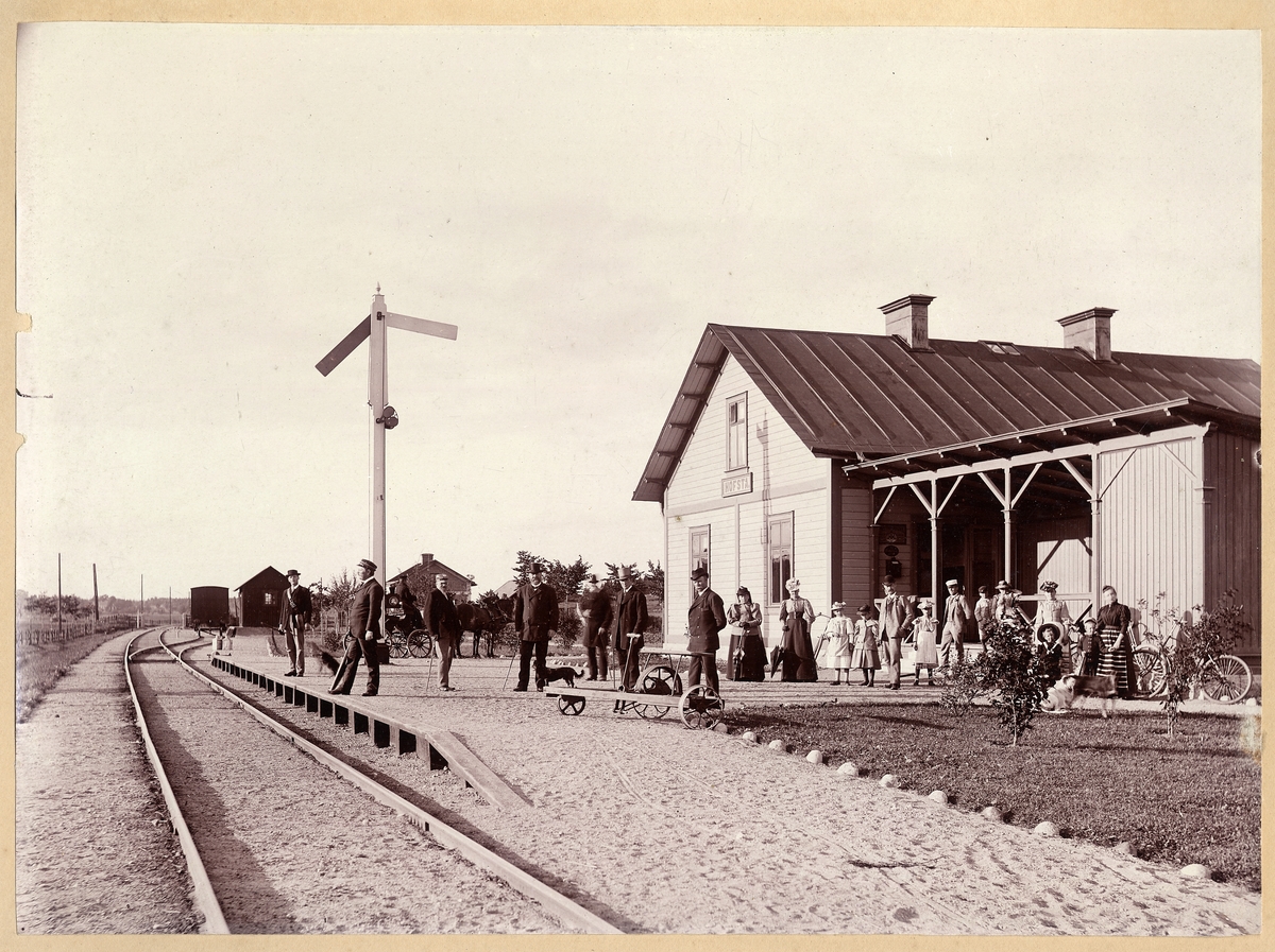 Hofsta stationshus med personal och resande framför år 1900.