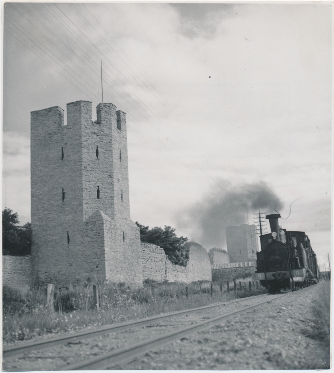 Tåg vid Visby ringmur. Ånglok GJ lok 5 Roma. Loket tillverkades 1894 vid Nydqvist & Holm AB, Trollhättan. Det blev skrotad 1952. Under perioden 1948-1952 ägdes av Statens Järnvägar som SJ K3p 3076.