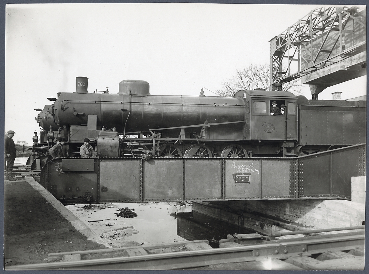 Klaffbron vid Norsholm över Göta Kanal. Provbelastning och förberedande besiktning av broklaffen. Statens Järnvägar, SJ Mc 763.