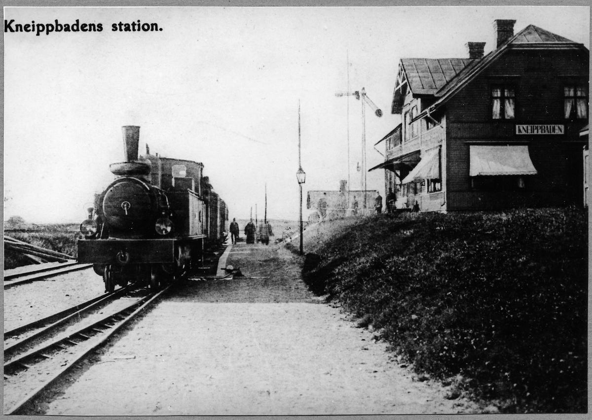 Kneippbadens station, namnet ändrades senare till Norrköping V. Tågsätt med ånglok, Norra Östergötlands Järnvägar, NÖJ lok 10 "Kimstad". Loket är tillverkat av Nohab 1904 för spårvidd 891mm.