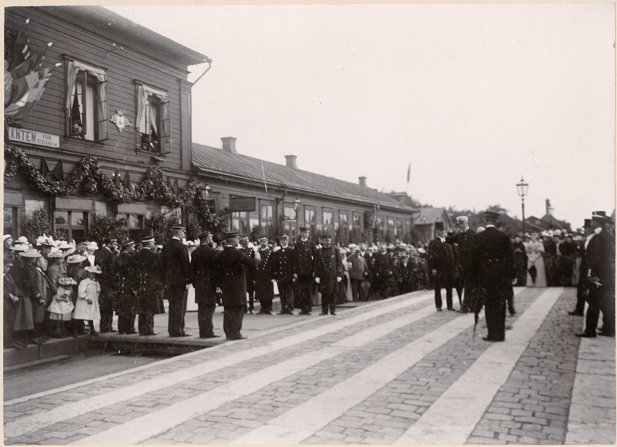 Fotografiet taget 1900 då kung Oskar II besökte Falköping Ranten station.