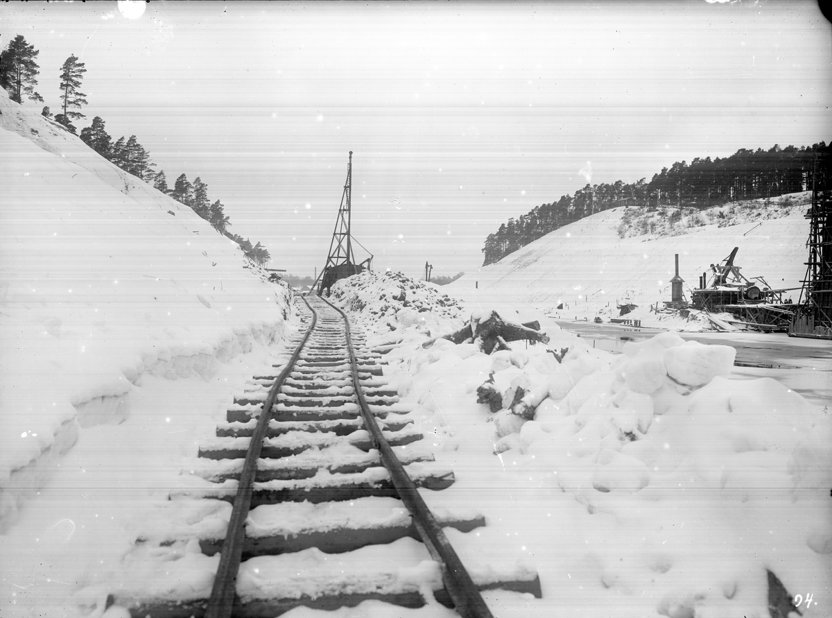 Södertälje Kanal. Transportspår och pålkran, södra kanalpelaren.