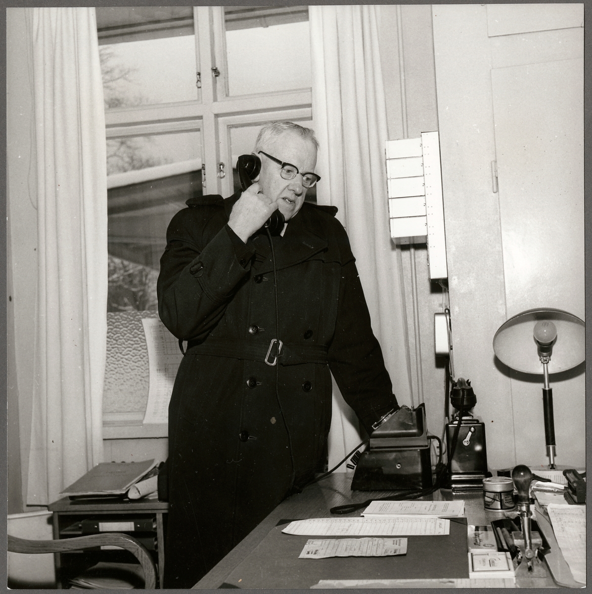 Man på kontor. Bilden tagen i samband med nedläggningen av bandelen Farlinge-Gimo, 1960-02-01.