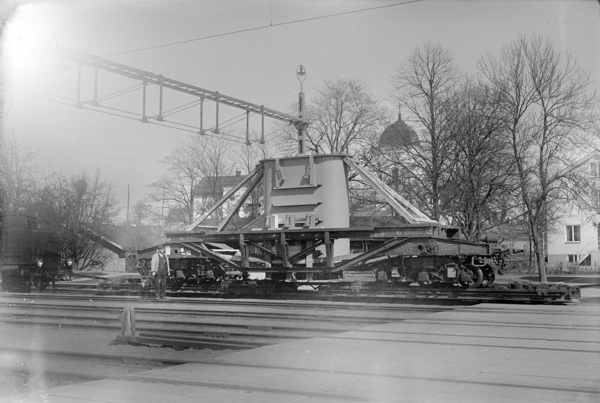 Smalspårsloket NÖJ 11 "Norrköping" vid Kimstad station, här med en öveföringsvagn lastat med en normalspårig djuplastningsvagn. NÖJ 11 "Norrköping" byggdes 1904 av Nydqvist & Holm AB för Norra Östergötlands Järnvägar. Loket byggdes om 1935. Vid förstatligandet 1950 fick det littera SJ S26p 3173. Det skrotades slutligen 1955.
