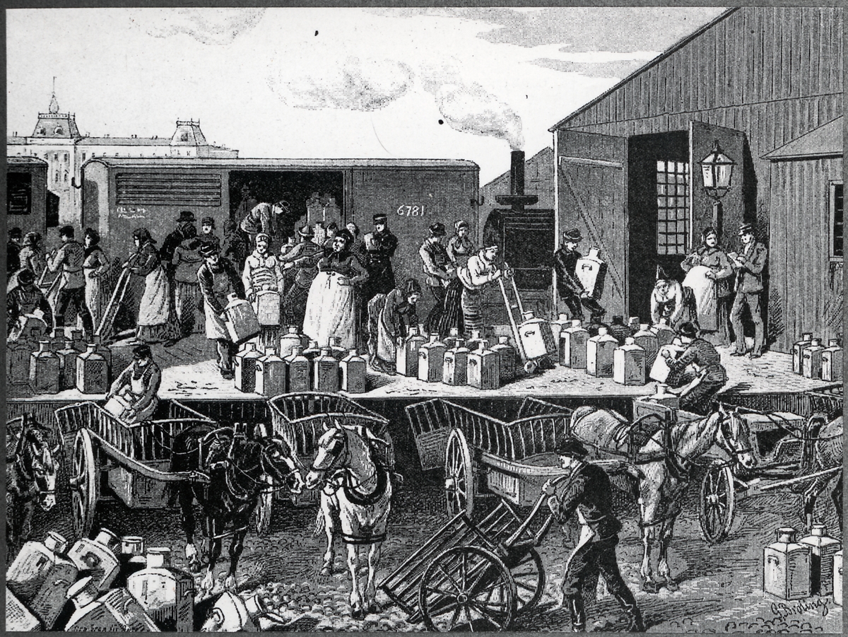 Ett mjölktågs ankomst till Stockholm Norra. Ur Hemvännerna 1886.