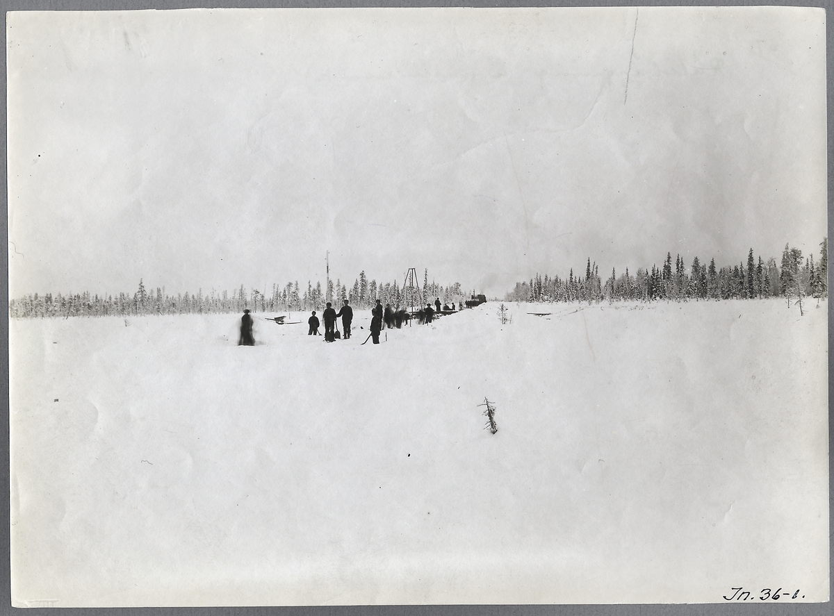 Från bygget av arbetsspåret mellan Gällivare och Porjus. Bilden visar snöskottning vintern 1910/1911. Man skottade i princip undan snön och började lägga ut sliprar och spår på den frusna marken.