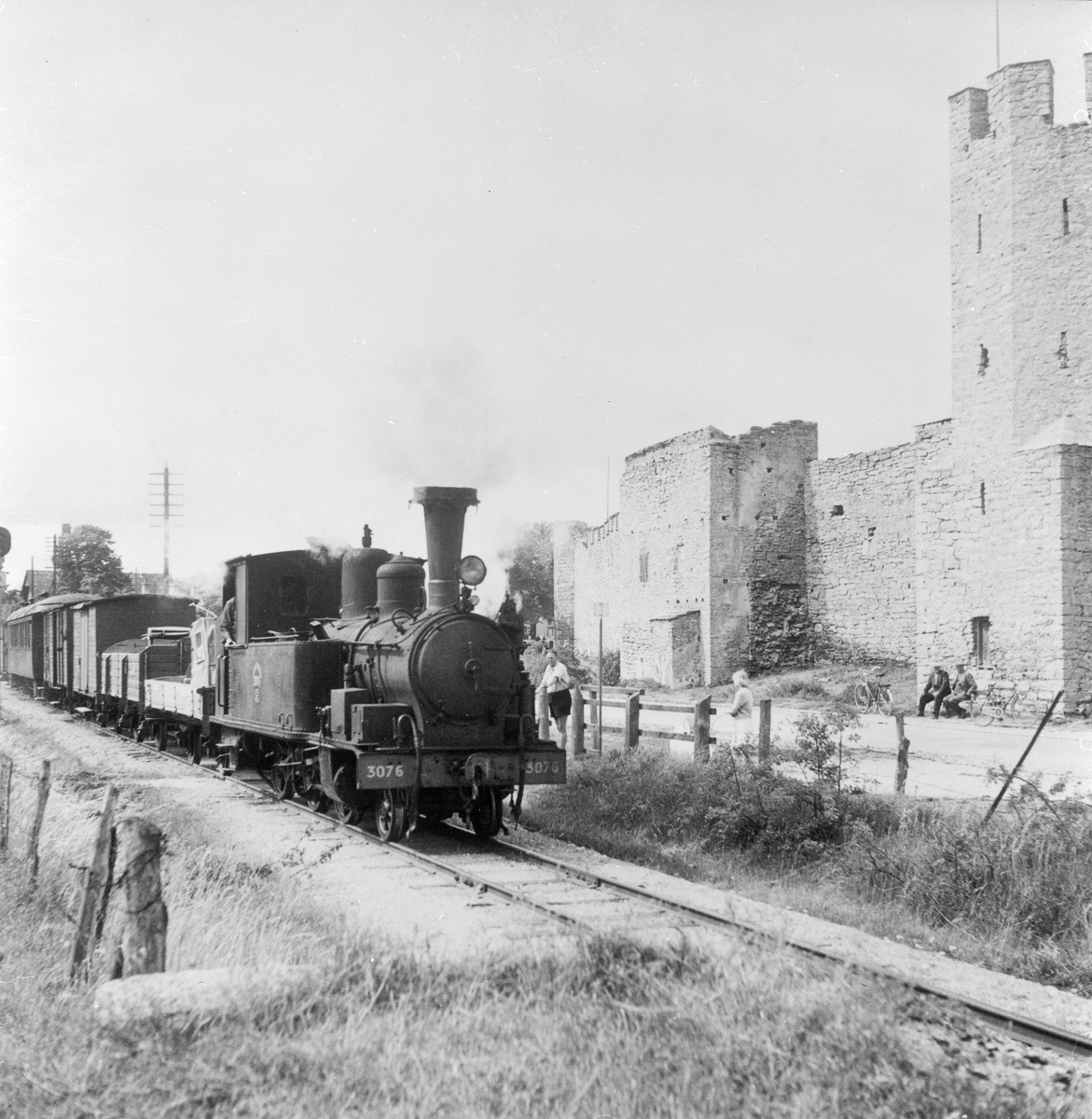 Statens Järnvägar, SJ K3p 3076 vid ringmuren. Loket ägdes av SJ under perioden 1948-1952. Det blev skrotad 1952. Första ägaren var Gotlands Järnvägar och loket hette då lok nummer 5 Roma. Loket tillverkades 1894 vid Nydqvist & Holm AB, Trollhättan.