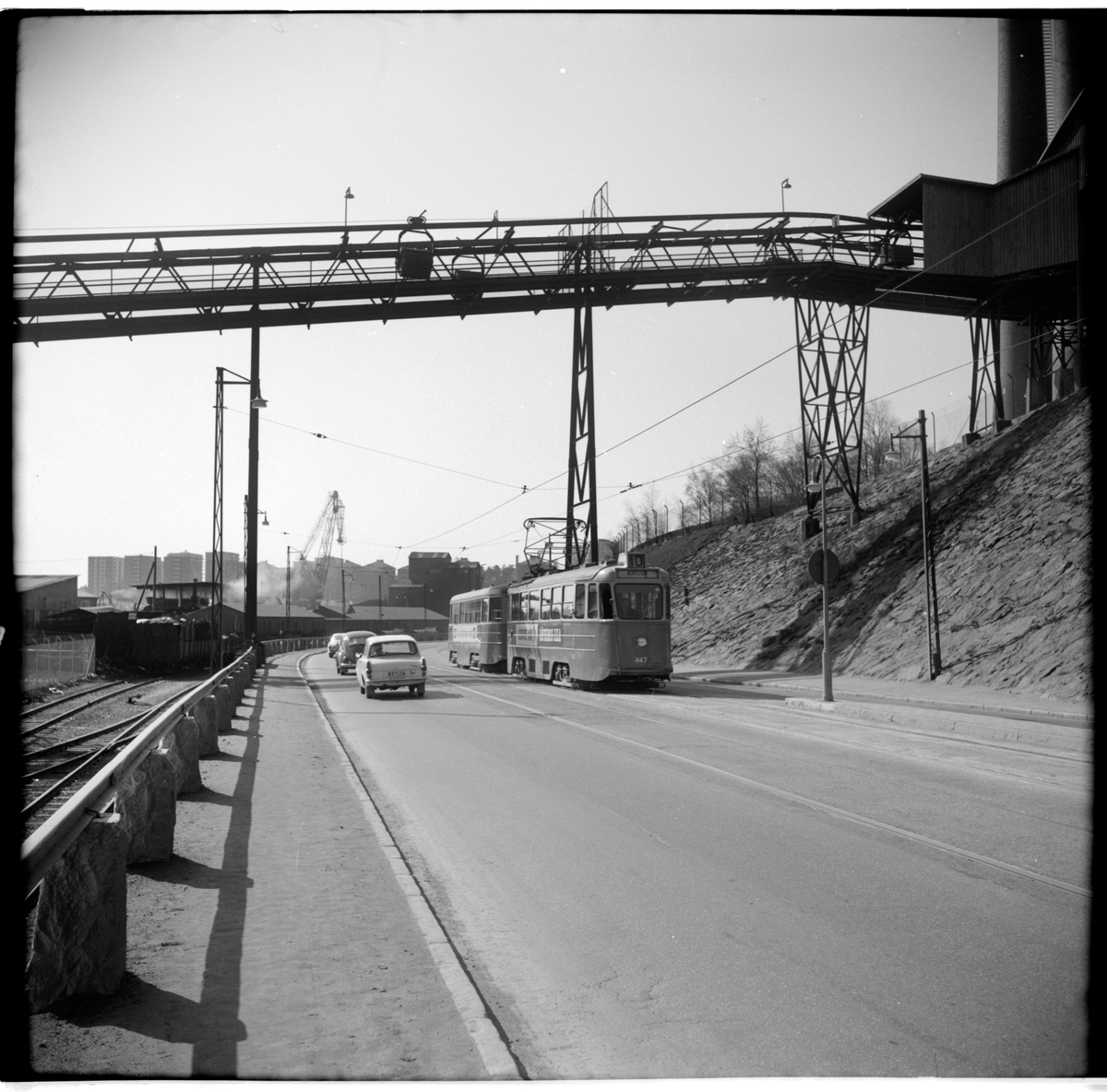 Aktiebolaget Stockholms Spårvägar, SS A25 447 "mustang" linje 10 Värtan - Slussen - Hornstull på Lidingövägen strax söder om Kolargatan med elverkets koltransport linbana.