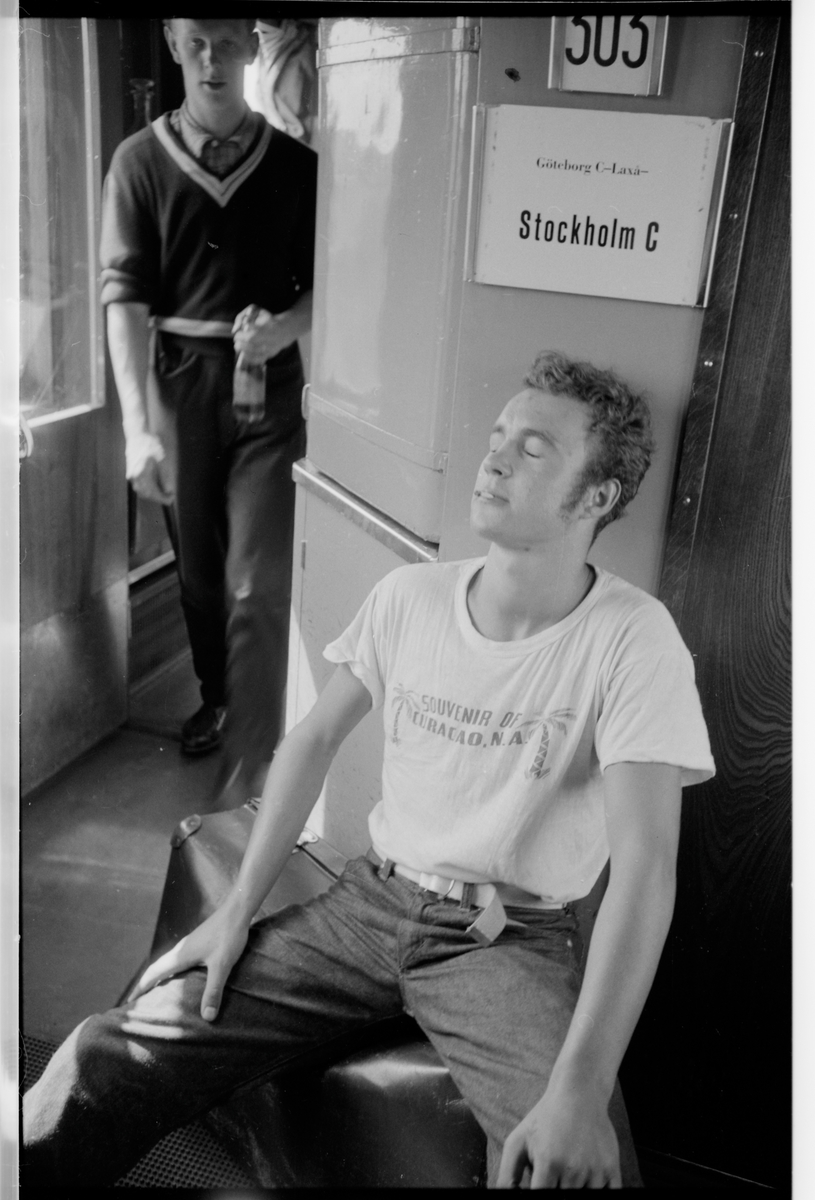 Ung man som tar en rökpaus i vagnskorridoren, någonstans på linjen mellan Göteborg C - Laxå - Stockholm C.