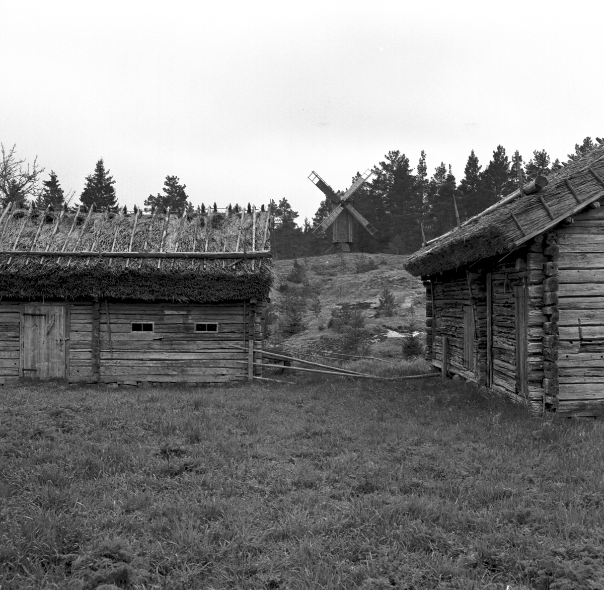 Ålandsresa. Timmerstugor med vasstak. Väderkvarn