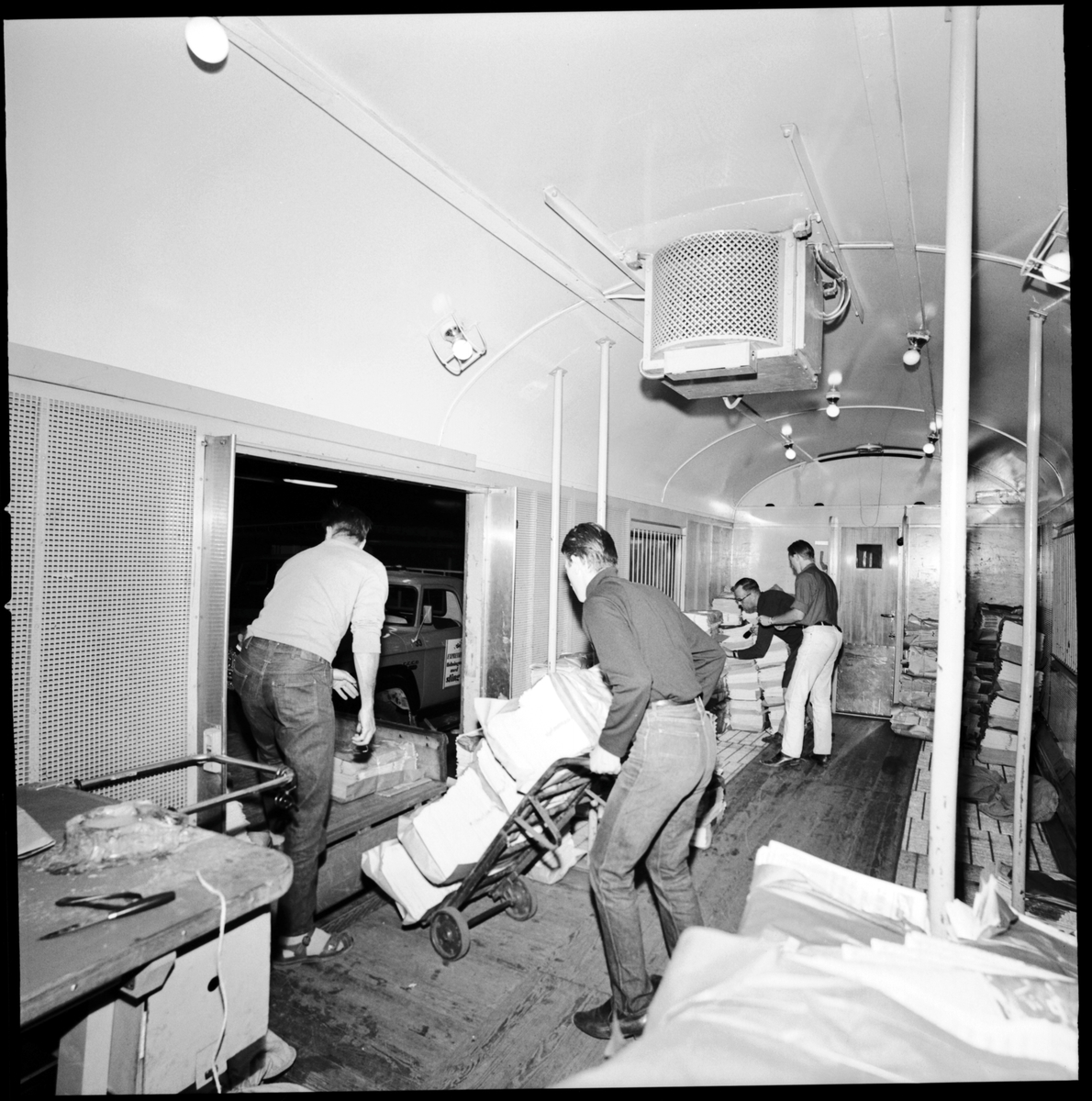 Tidningslastning av buntade tidningar för Pressbyråns räkning, vid vid Ilgodset och bangårdsposten.