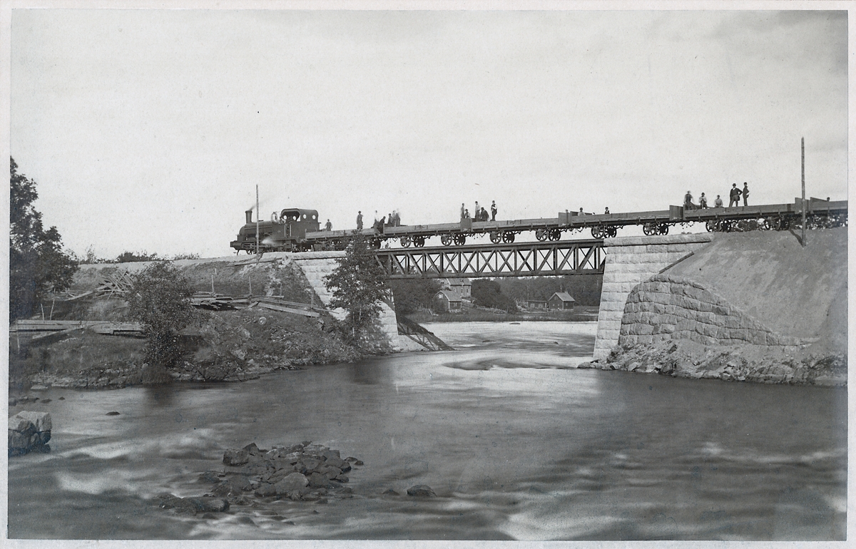 Hallsberg - Motala - Mjölby Järnväg, HMMJ. Lok 3 eller 4 med gruståg på järnvägsbron över Svartån vid Älvkulla på linjen mellan Mjölby och Skänninge.