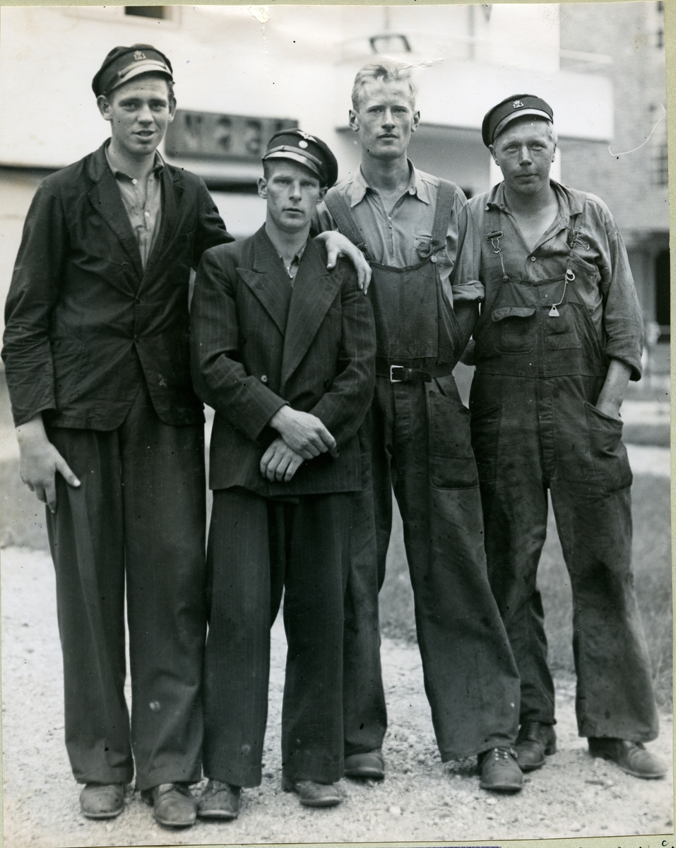 Från vänster Gustaf Åkerlund, stationskarl Folke Lindbom, Olof Johnsson och Gösta Dahmström.