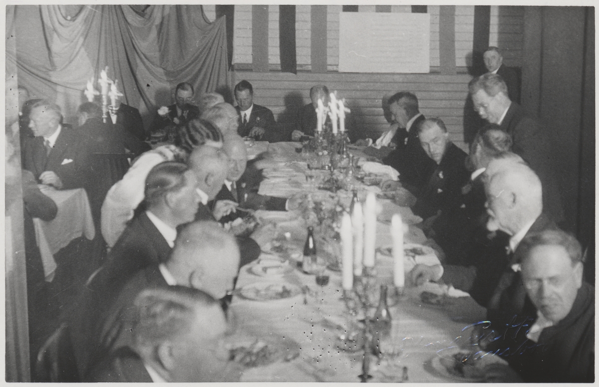 Invigningsmiddagen för Statsbanan Malung-Vansbro som hölls i biograflokalen i i Malung. Stående till höger i bild ses Landshövding Bernhard Johansson.