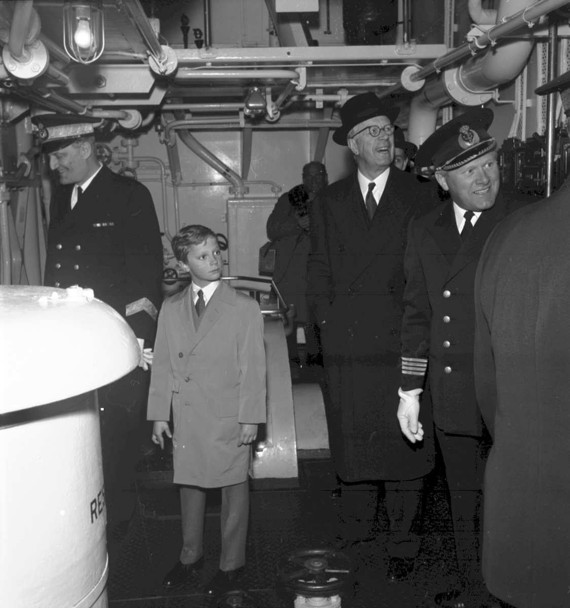 Kungabesöket på tågfärjan "Trelleborg" i Stockholm, Gustav VI Adolf och kronprins Carl Gustaf sedemera Carl XVI Gustaf. Generaldirektör Erik Upmark