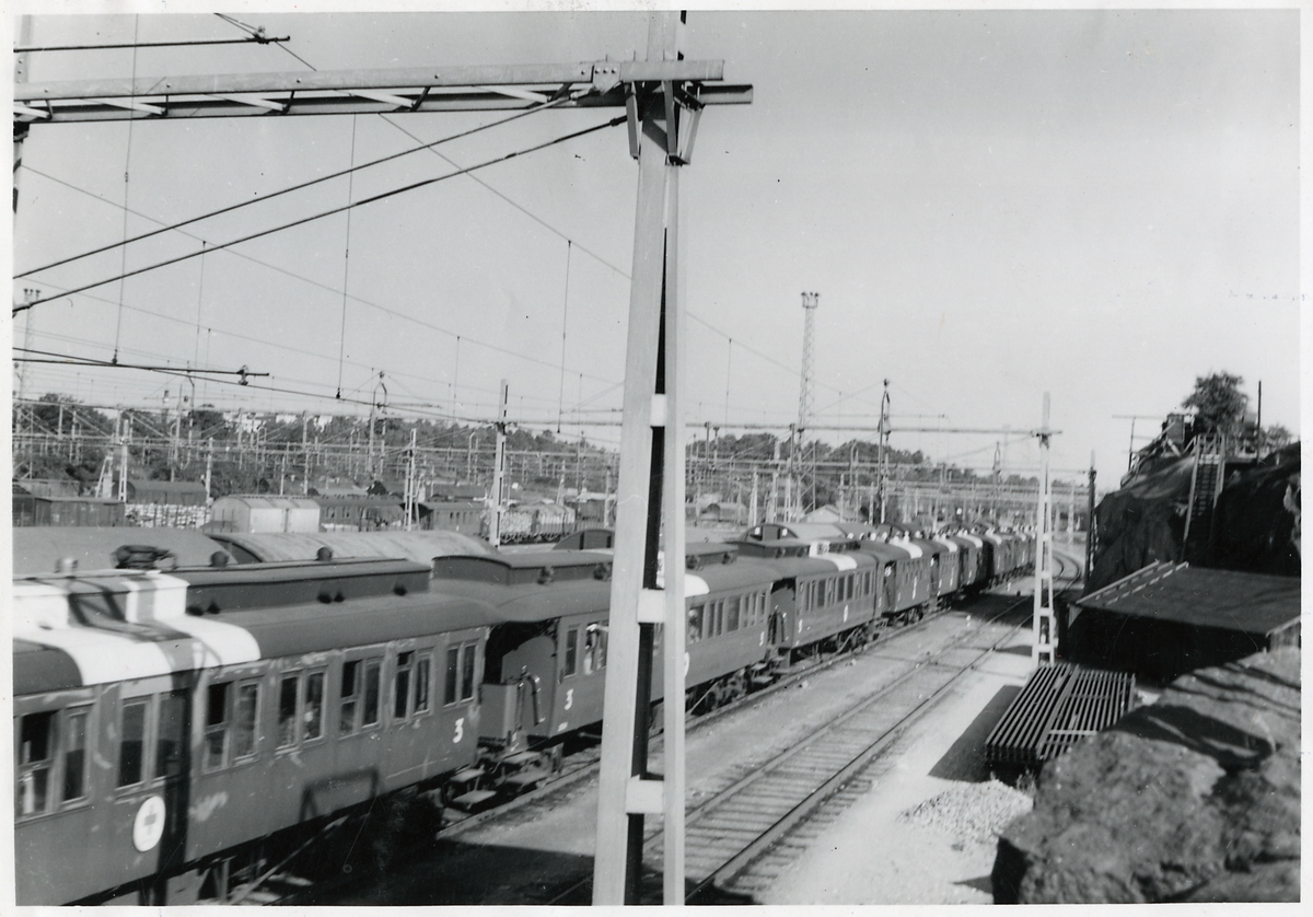 Arméns sjukhuståg med finska barn från Umeå kommer till Tomteboda. Vagnen närmast är läkarvagnen SJ BCo5c, därefter två Co5 samt ett antal C3d-vagnar. Alla enligt föreskrifterna märkta med ett rött kors på taken.