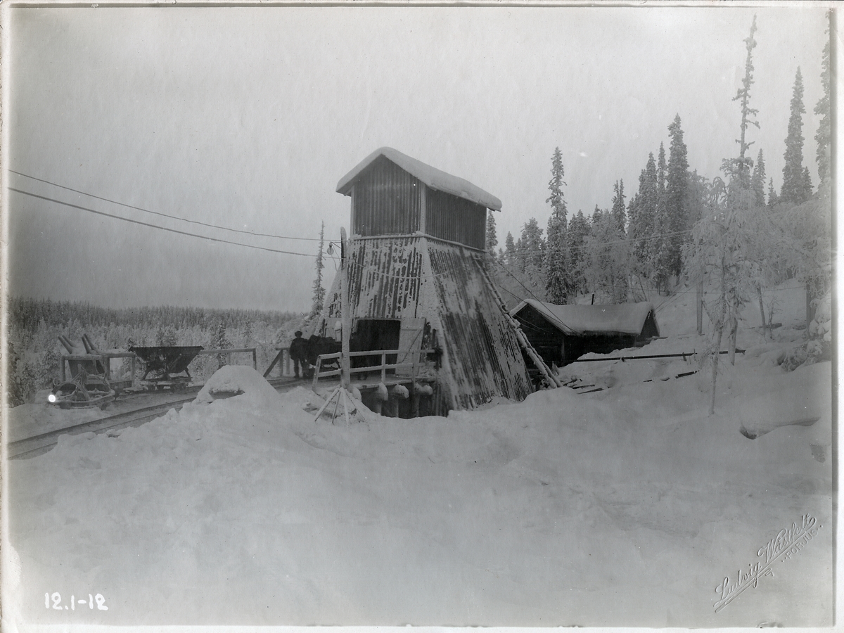 Bilden visar en lave, eller uppfordringsverk i Porjus, där kraftverksbygget pågår under åren 1910-1915.